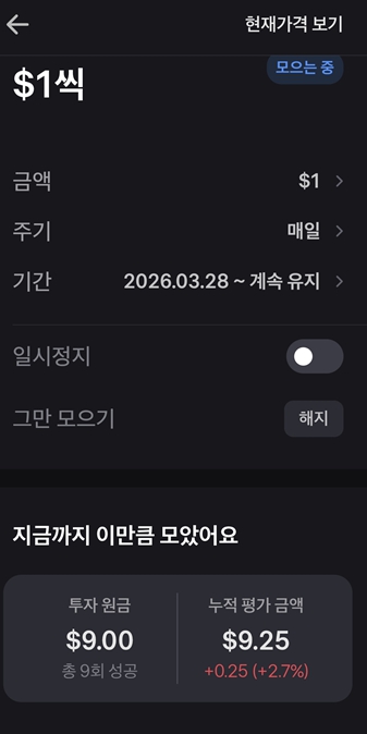 1. "시작이 반이다"를 실감 중 처음엔 "$1로 뭐가 될까?" 싶었지만, 벌써 $9가 쌓였고 수익도 발생하고 있습니다. 작은 돈이라도 시장에 머물러 있는 것이 얼마나 중요한지 다시 한번 느낍니다.